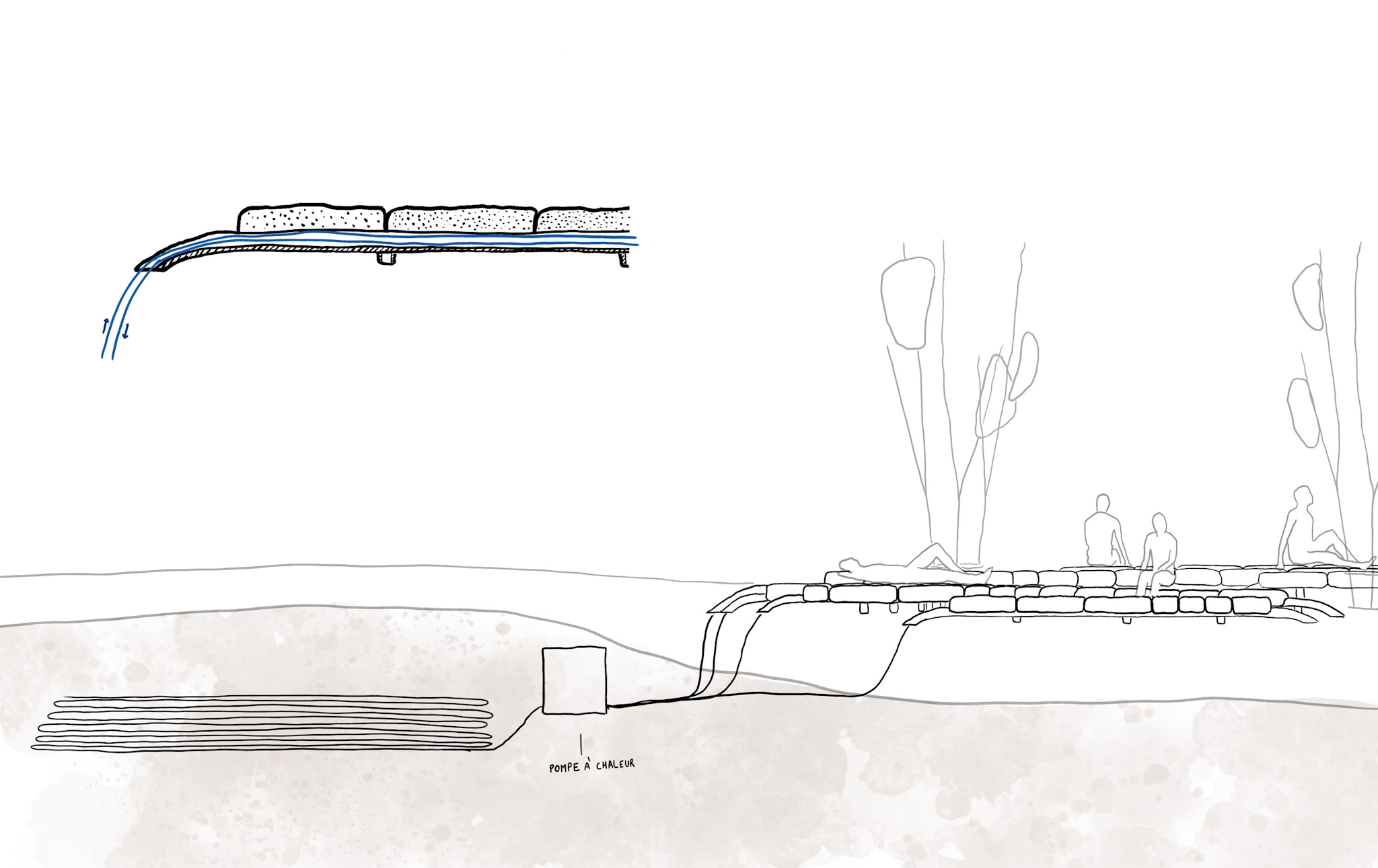 The Geothermal Garden is a quiet, temperate space located in the forecourt of metro stations. A geothermal system circulates through the garden benches, cooling them during heat waves and warming them in winter.