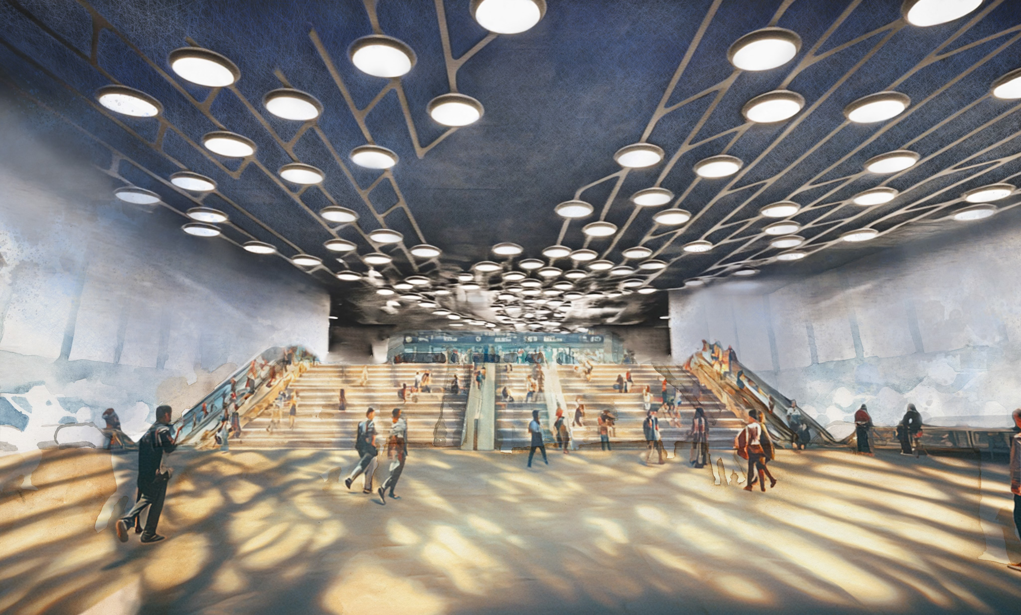 The Indoor sky is a lighting system designed for metro stations. It reproduces the sun's cycle, producing the same wavelengths as the sun itself. In this way, the underground environment of the metro is connected to the outside world and to our body's hormonal cycle.